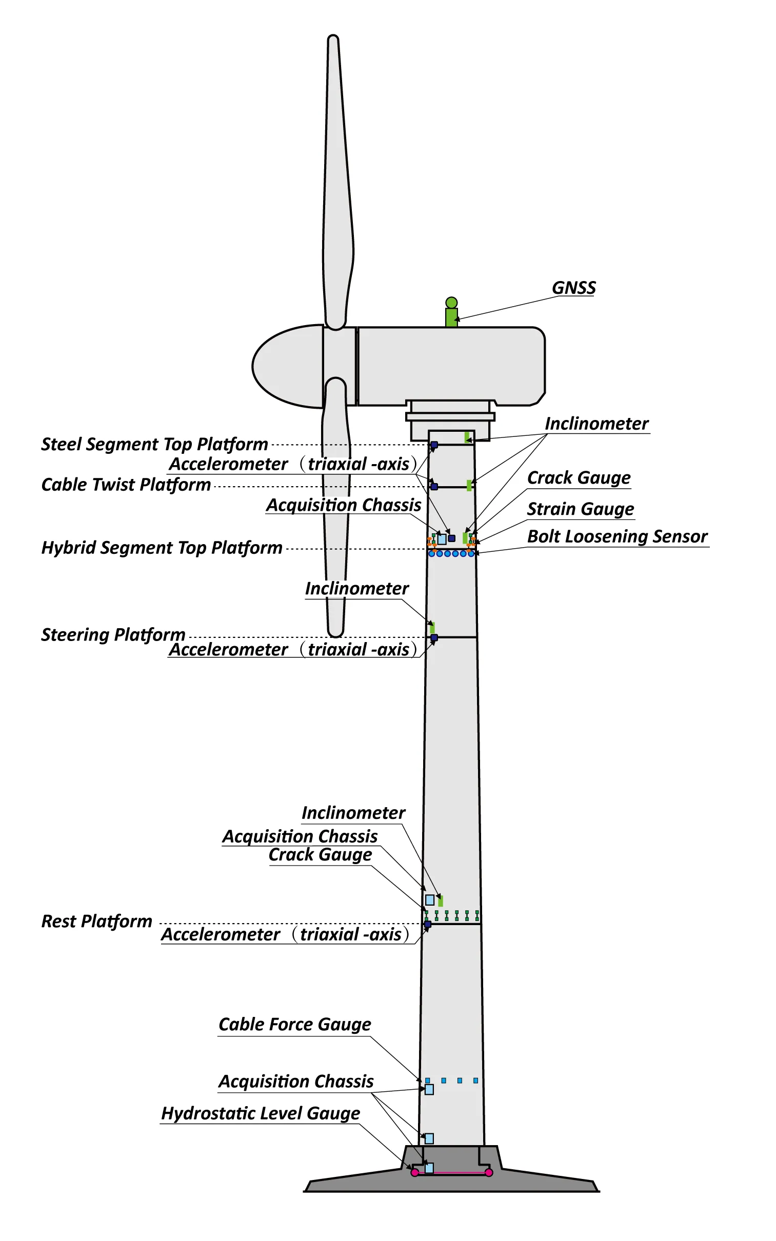Vėjo turbinų bokštuose įrengiant atitinkamus jutiklius būklei stebėti, pagrindinis vėjo turbinų bokšto konstrukcinių komponentų stebėjimo turinys turėtų apimti: bokšto vibracijos stebėjimą, bokšto nuolydžio stebėjimą, viršutinės perėjimo dalies įtempių stebėjimą, bokšto korpuso įtrūkimų stebėjimą, bokšto poslinkio stebėjimą, bokšto pamatų nuosėdų stebėjimą, kabelių jėgos stebėjimą ir kt., kad būtų pasiektas saugaus vėjo turbinos veikimo tikslas.